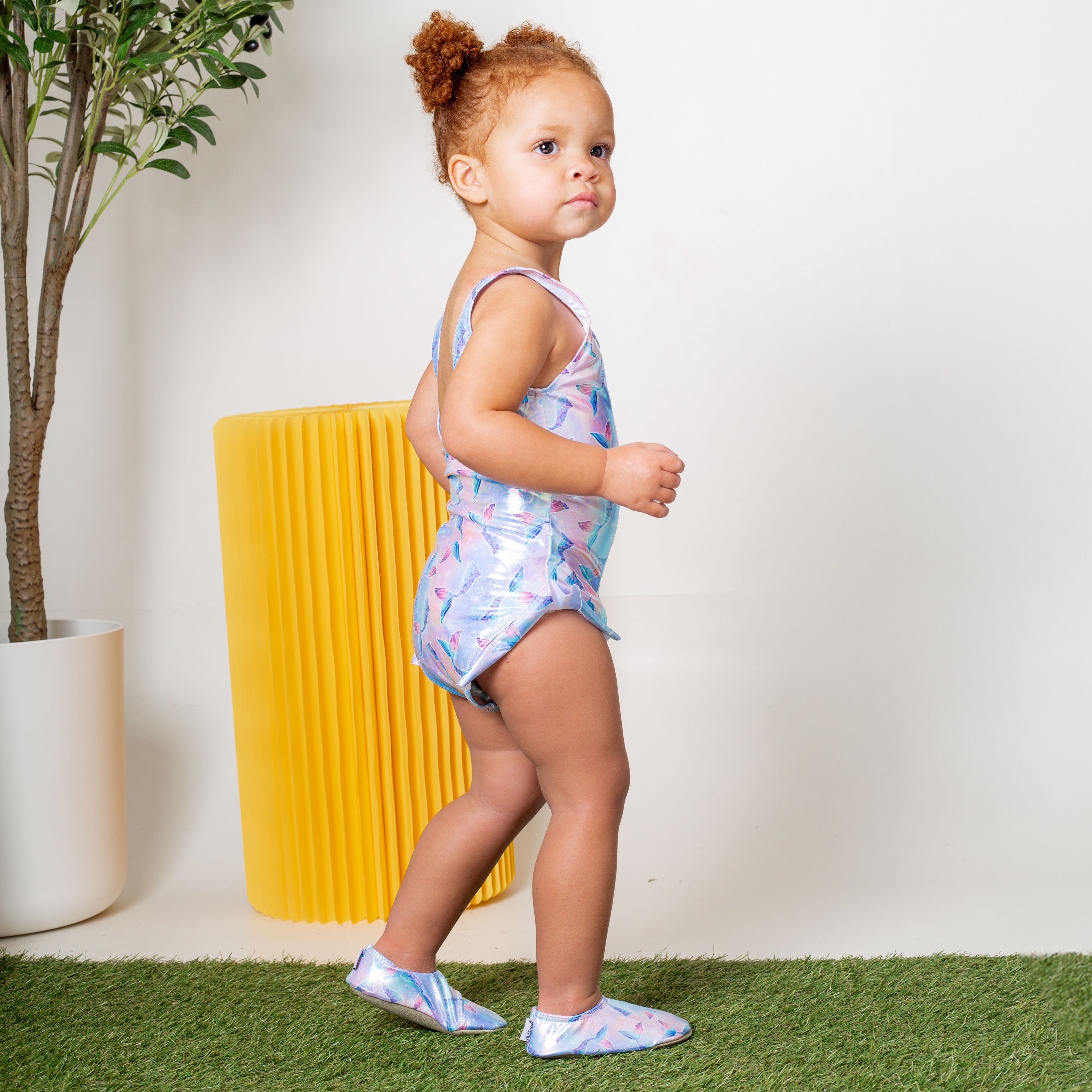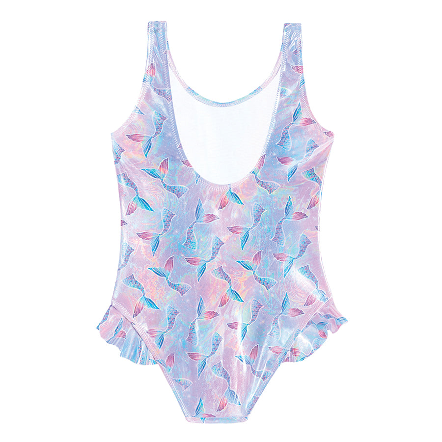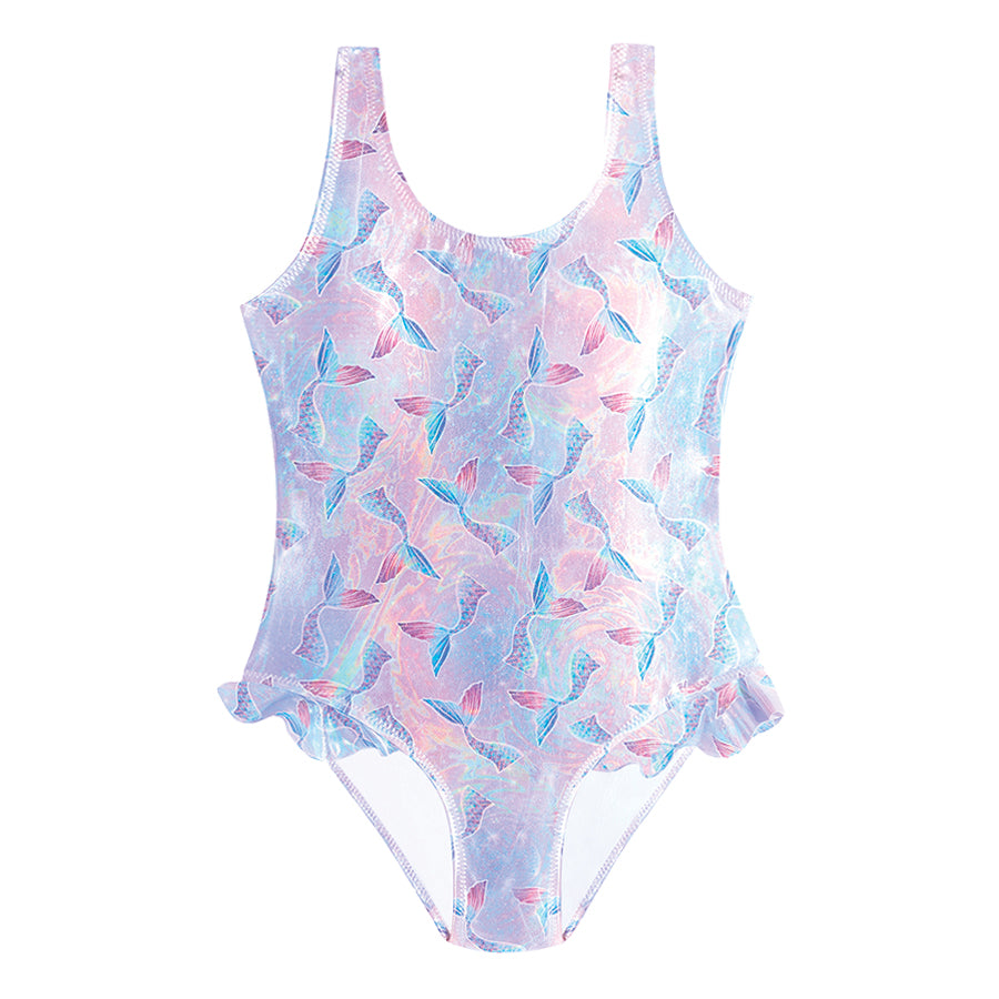 Introducing Venice, our stunning foil print Slipfree® UPF 50+ Swimsuit with adorable leg frill that transports you to a world of celestial wonder and underwater magic. The shimmering pearl like foil print design features an ombre galaxy background in blues, lilacs & pinks which is adorned with graceful mermaid tails.