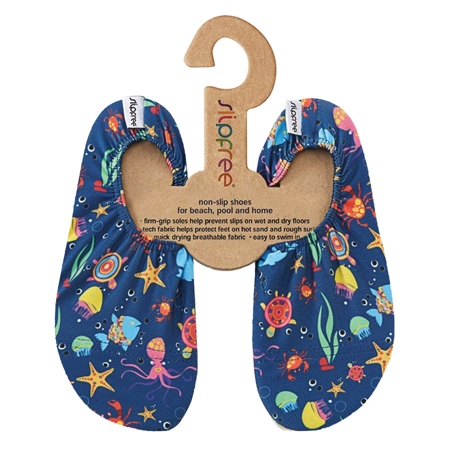 Embark on your next seaside adventure with this vibrant ocean print Slipfree shoes! With friendly colourful sea creatures swimming around the deep blue background, your little one will look great exploring the coral reefs!