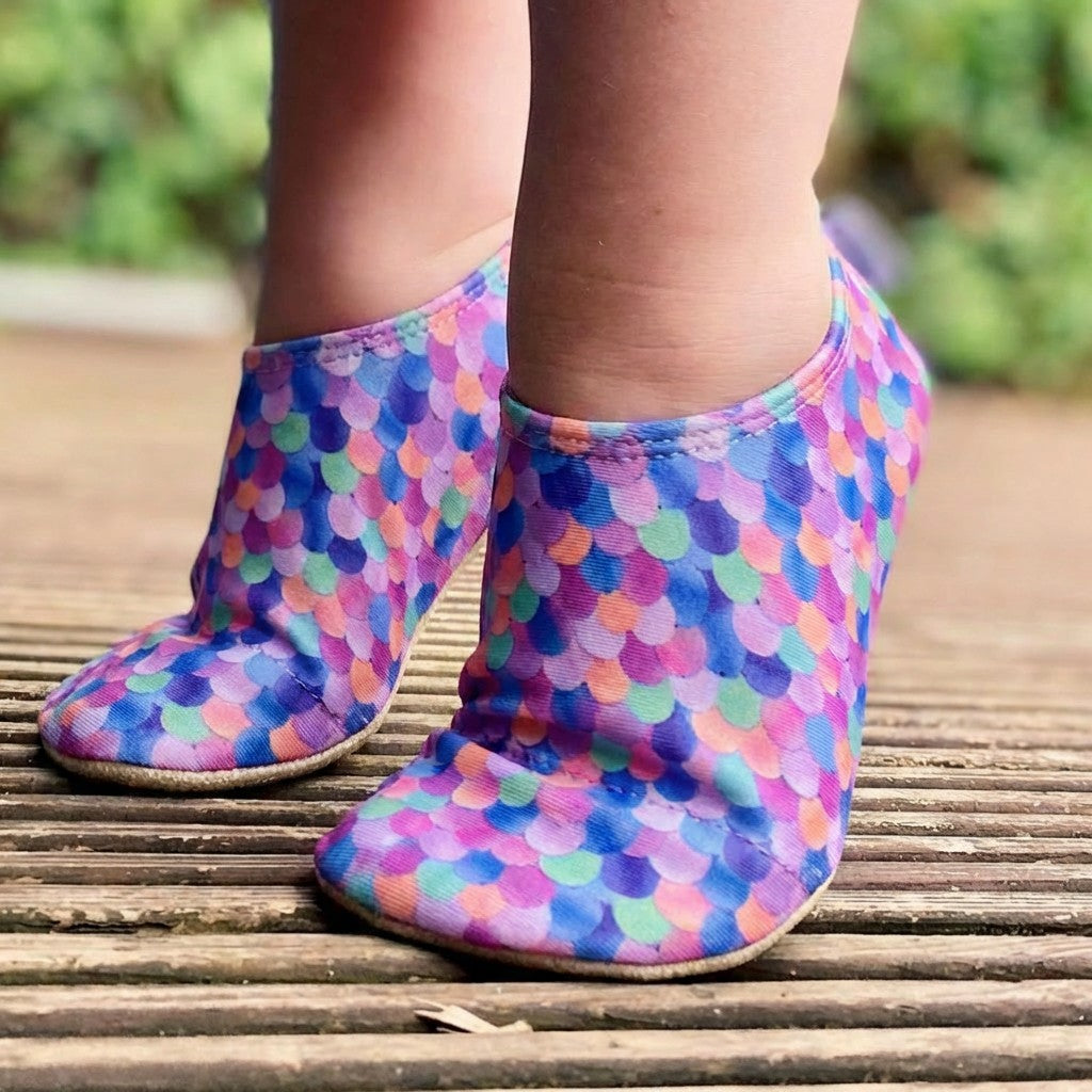 'Step into a world of fun with our Slipfree Sequin barefoot shoes Designed to look just like real sequins, these pastel-perfect shoes are covered in a beautiful scalloped pattern with soft shades of purple, pink, mint, peach, and blue—just like a dreamy underwater rainbow!