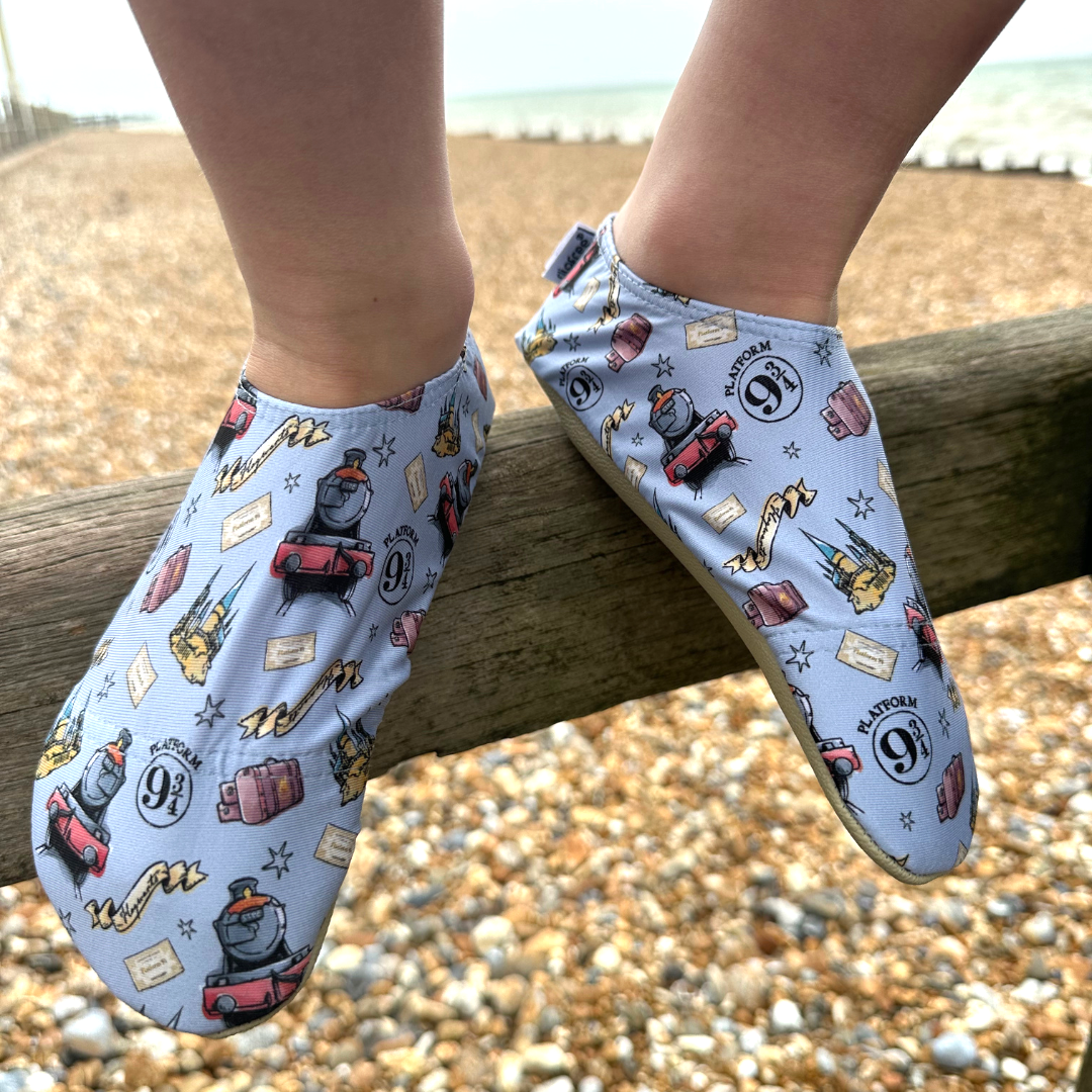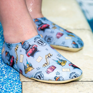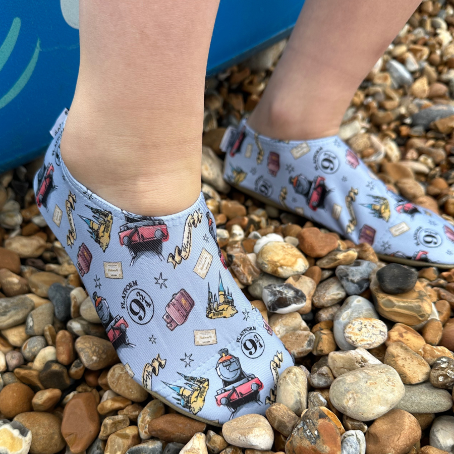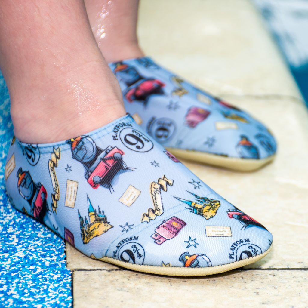 These super cool Slipfree swim shoes are named Express after the famous wizard train that zooms young witches and wizards off to Hogwarts! With a soft, misty grey background, the Hogwarts Express chugs along in all its bright red, puffing glory - ready to take you on a splashy Harry Potter™ adventure full of wonder and wizardry!