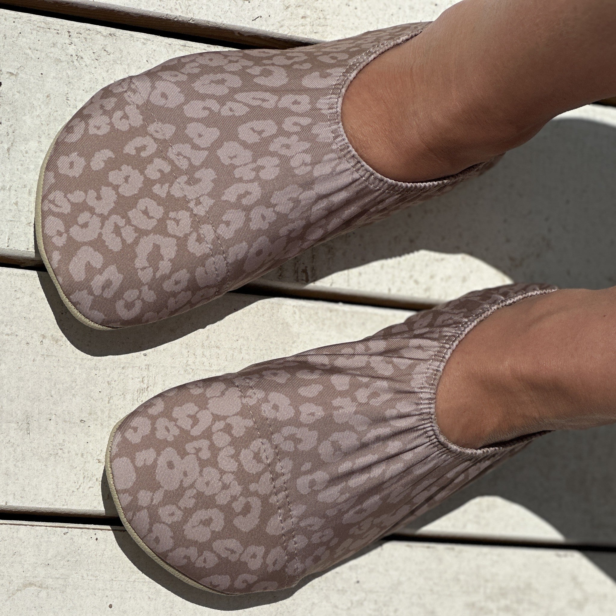 'Step into effortless style with our Leopard print Slipfree® barefoot shoes. Featuring a subtle blend of neutral sand and beige leopard print, these sleek and understated shoes offer the perfect balance of comfort and grip. Whether you're by the pool, strolling the shore, or flowing through your yoga practice, move with confidence and ease.