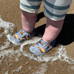 Introducing our industrious and stylish grey Mixer Slipfree® non-slip swim shoes constructed with vibrant yellow diggers and mixers - a must-have accessory for little ones who love construction and adventure!