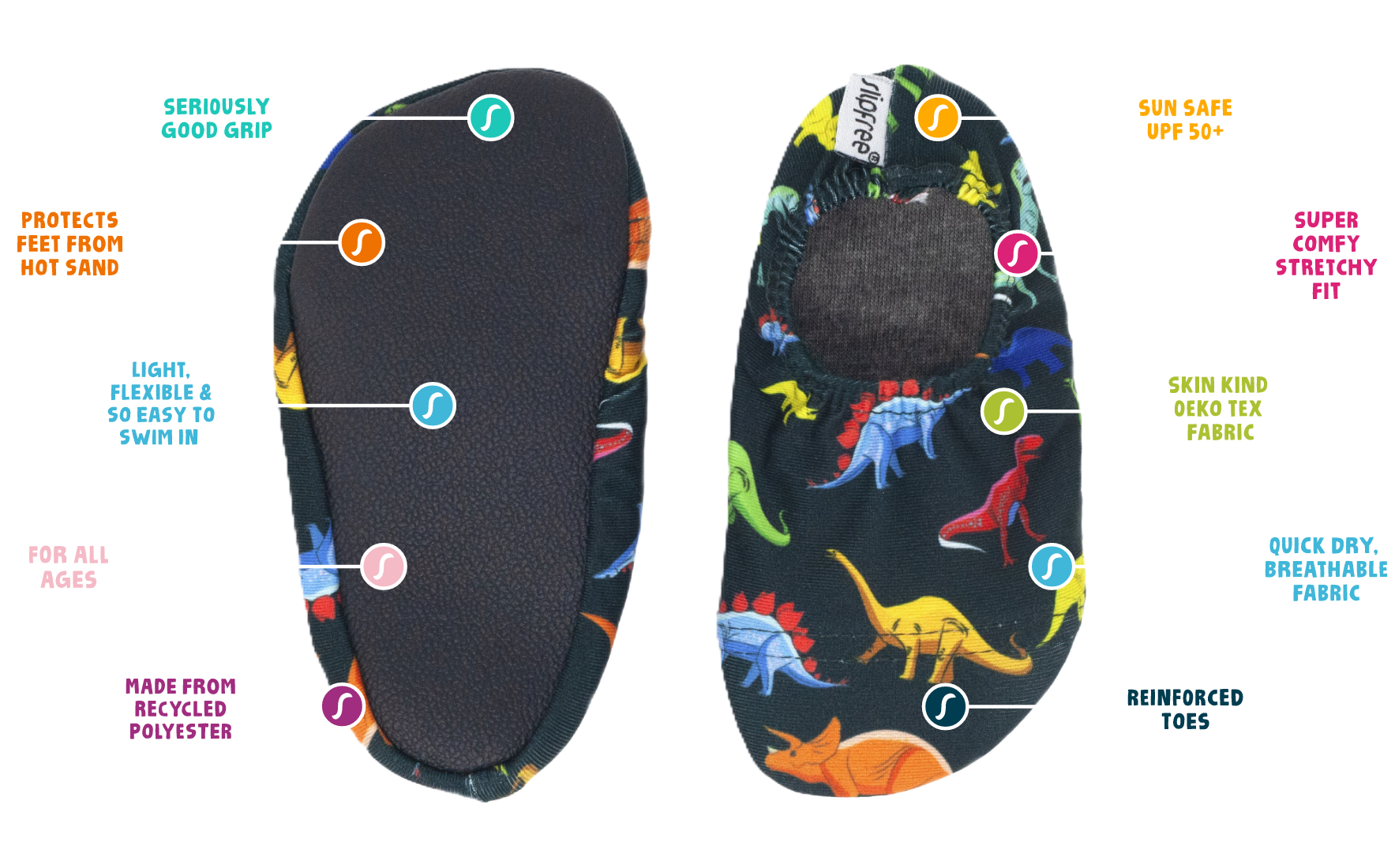 Grippy soles to help prevent slipping No more hopping on hot sand & floors Lightweight & Easy to swim in Help say Bye Bye to Verrucas Super Soft & Stretchy, easy to put on Help Protect from owchies underfoot Sun Safe UPF50+NOT SURE WHICH SIZE?